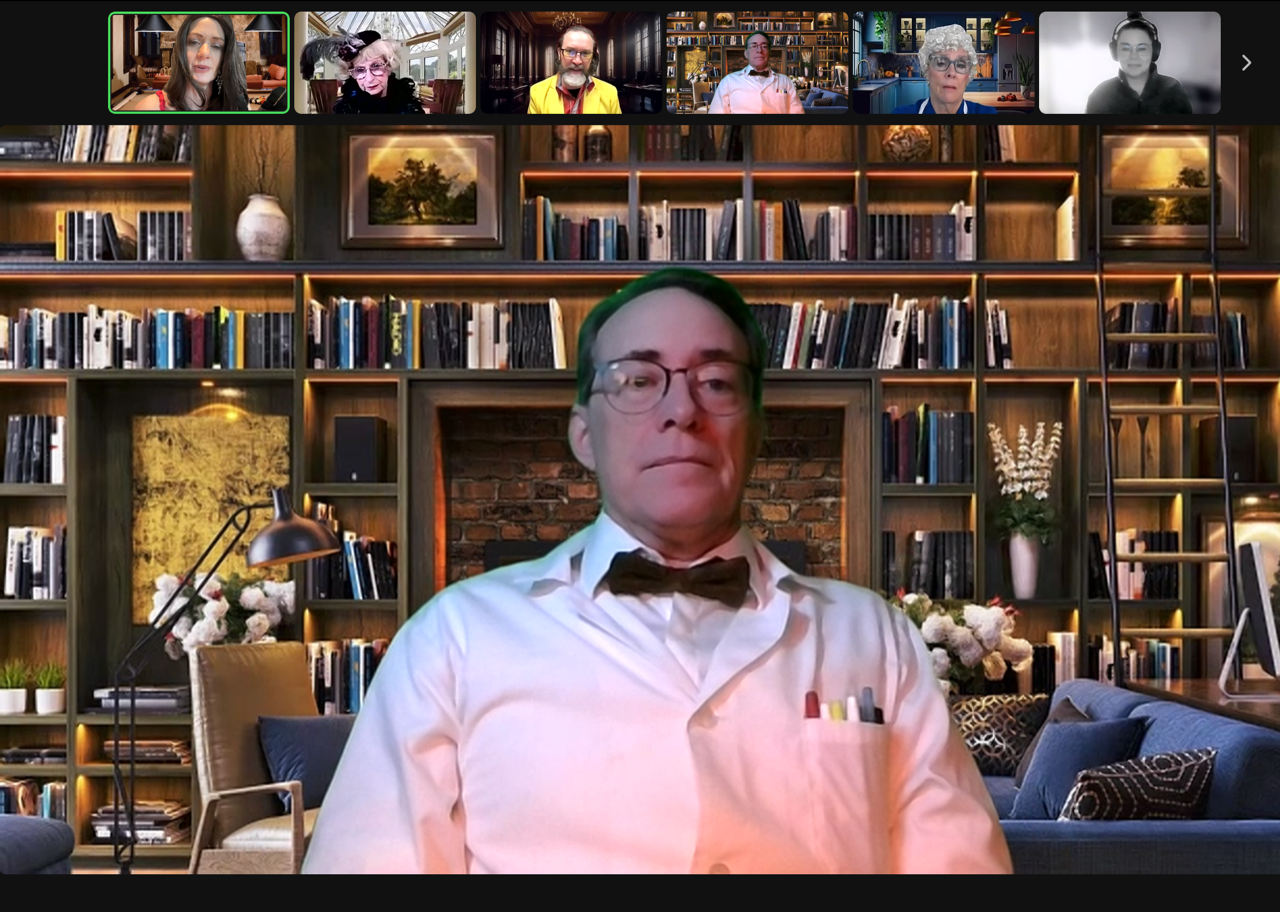Our virtual shows are live, hosted by professional improvisers and actors (yes, real humans—no pre-recorded nonsense). Guests join via Zoom, Microsoft Teams, or your preferred platform, and the show unfolds right in front of them.